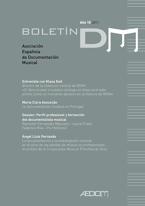 La documentación y la investigación musical en el seno de las bandas de música no profesionales: el archivo de la Corporación Musical Primitiva» dentro de Boletín DM de la Asociación Española de Documentación Musical, 15, 2011, pp. 37-48.